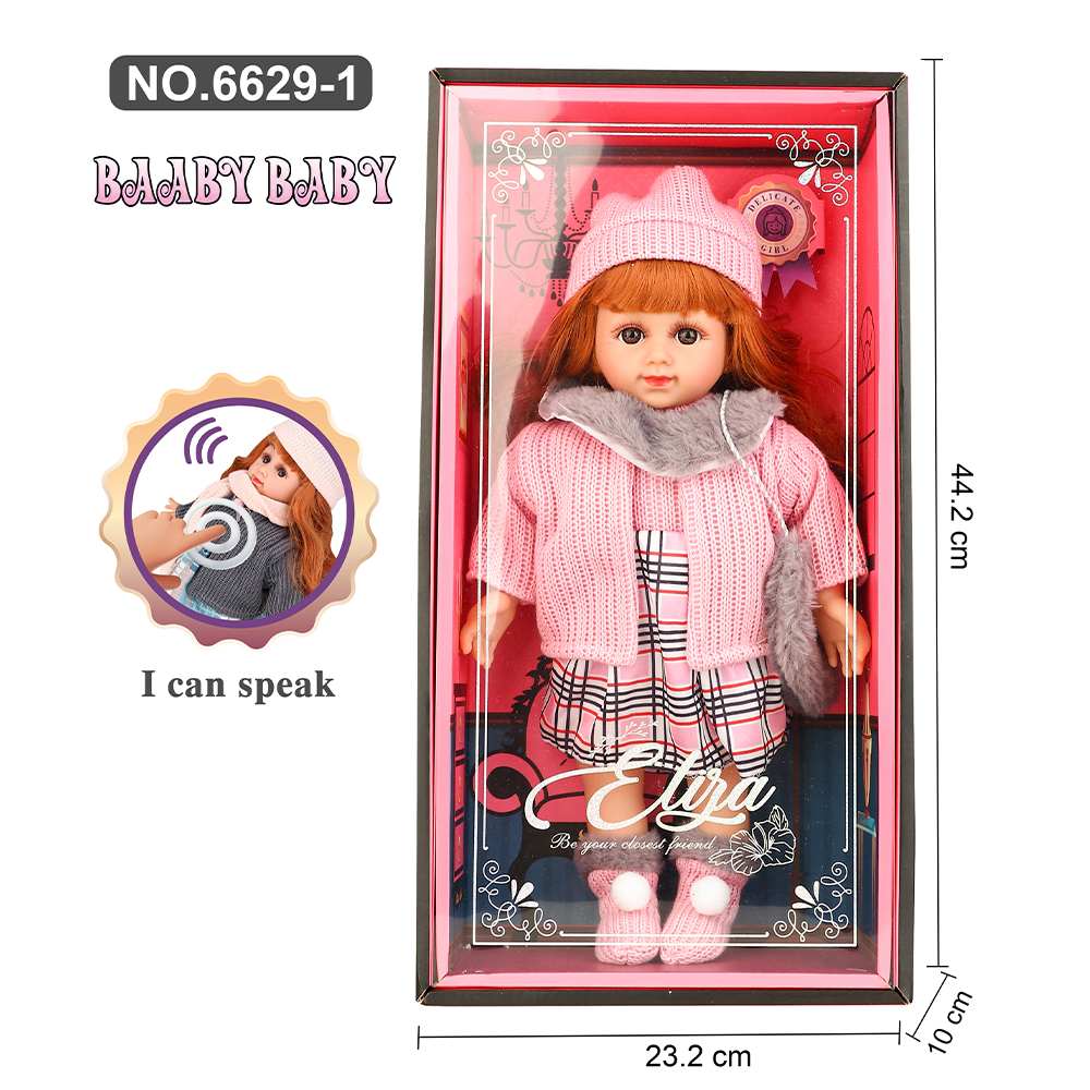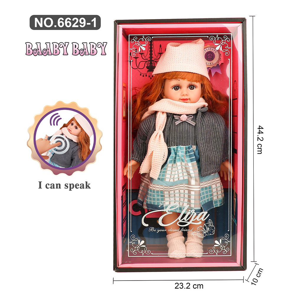 A pair of speaking fashion dolls presented in elegant display boxes, each measuring approximately 44.2 cm in height and 23.2 cm in width. Both dolls feature realistic facial details, long hair, and removable winter-style outfits. One doll is dressed in a grey sweater with a scarf, matching hat, patterned skirt, and boots, while the other wears a pink sweater with coordinating hat, scarf, checkered skirt, and winter boots. The interactive “I can speak” feature adds engagement for children during pretend play. The dolls are suitable for gifting, collecting, or display due to their detailed clothing, premium packaging, and medium–large size form factor.