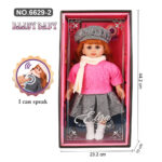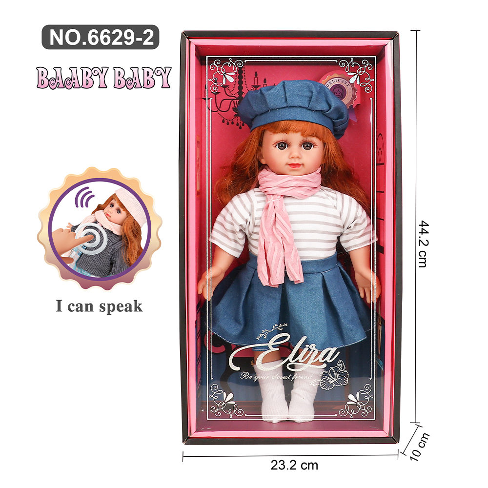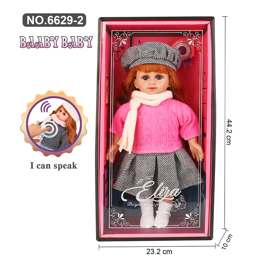 A pair of speaking fashion dolls presented in stylish display boxes, each featuring detailed clothing with a charming winter-inspired look. One doll wears a striped top with a blue skirt, matching beret, and scarf, while the other wears a pink sweater with a grey skirt, matching beret, and scarf. Each doll includes an interactive voice feature indicated by the text “I can speak.” The approximate dimensions are 44.2 cm in height and 23.2 cm in width, offering a medium–large size suitable for both play and decorative display. Designed with realistic facial features, long hair, and removable clothing, making them ideal for pretend play, gifting, and collection.