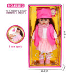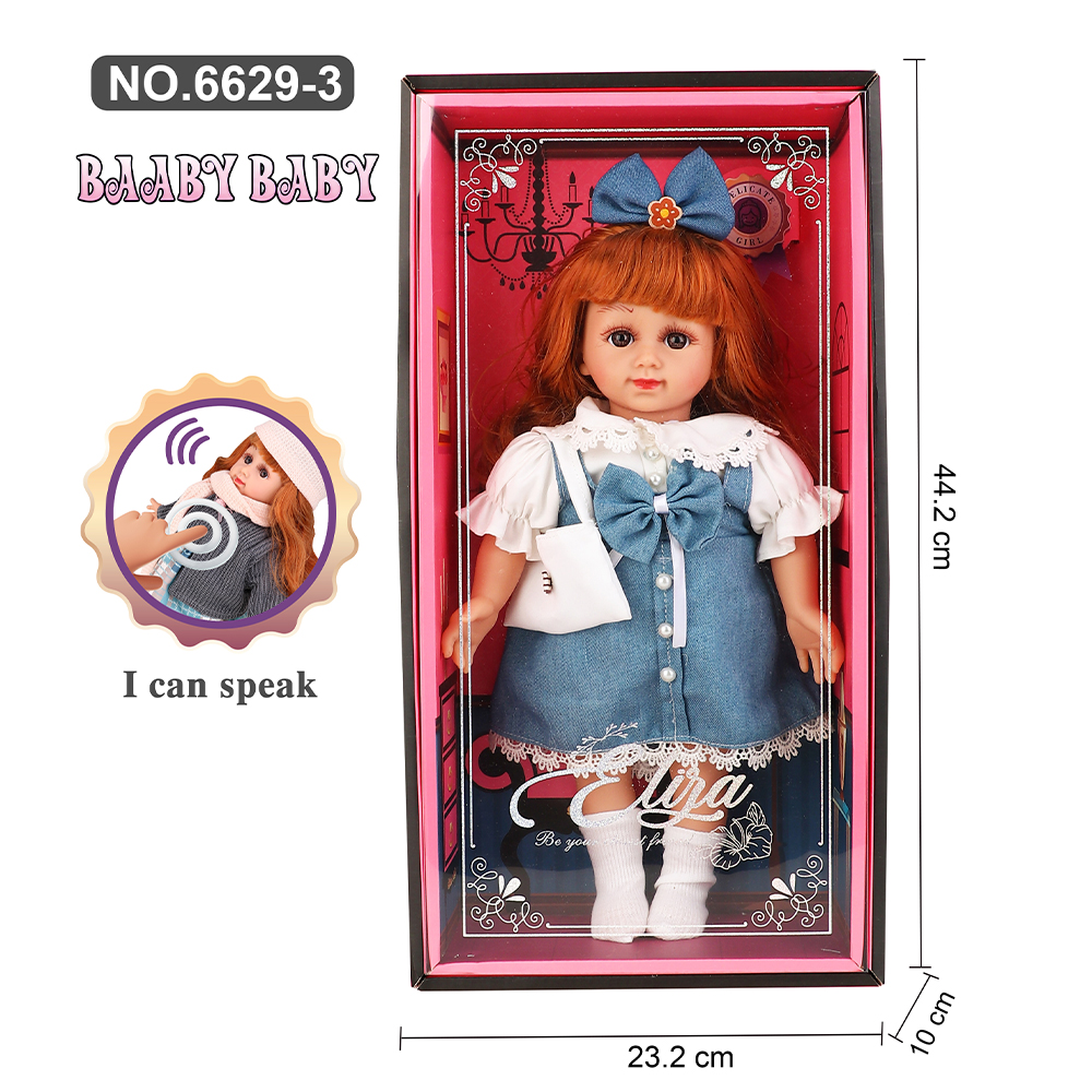 These are talking dolls presented in a premium black display box with a decorative pink interior. Each doll has strawberry-blonde hair with full bangs, soft facial detailing, and removable winter-style outfits. Clothing includes knit sweaters, patterned skirts, matching winter hats, scarves, and knee-high socks. The “I can speak” label indicates that the dolls feature touch-activated voice functionality. Packaging dimensions are provided as 44.2 cm in height, 23.2 cm in width, and 10 cm in depth, emphasizing their substantial size for play, gifting, or collection.
