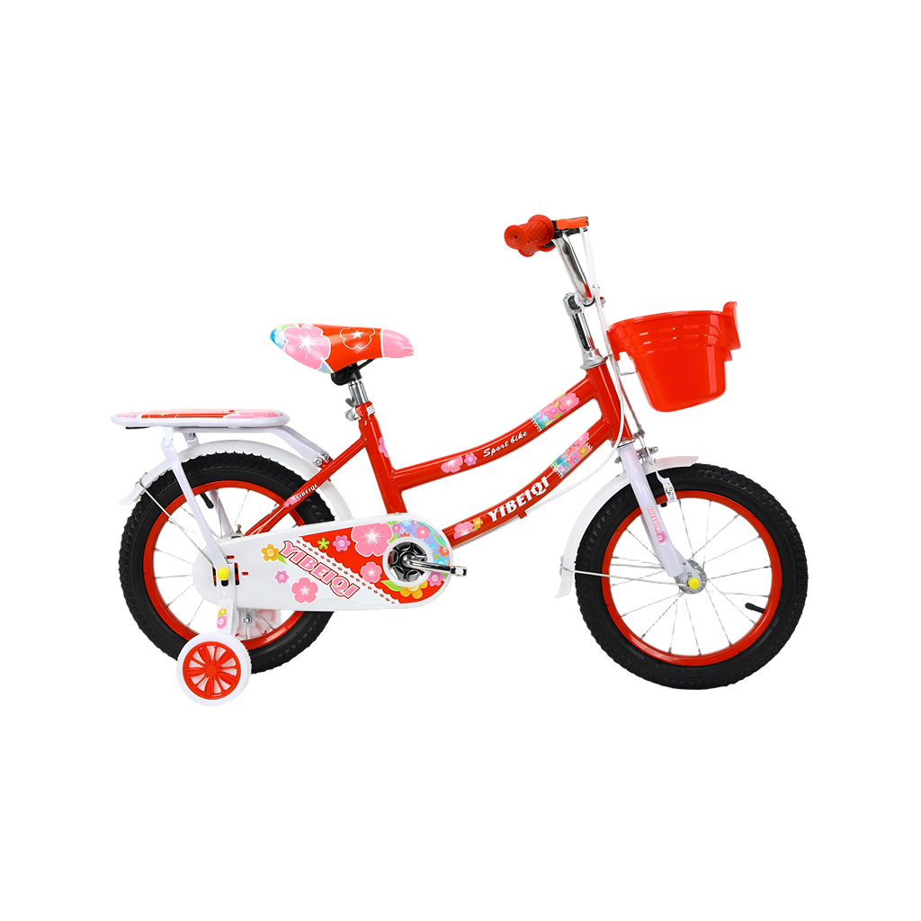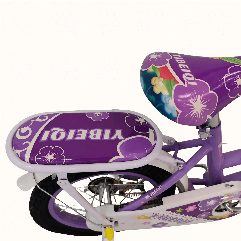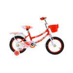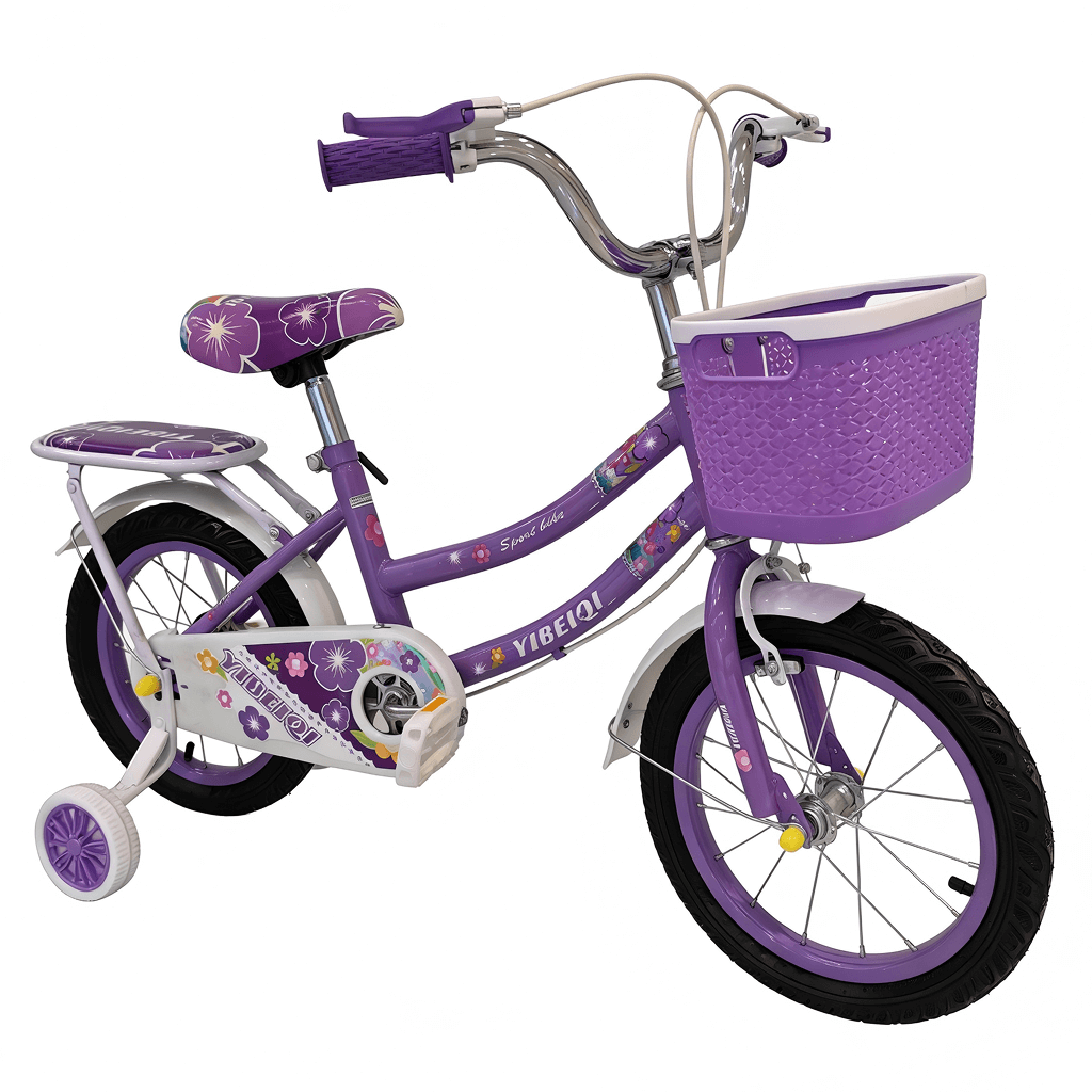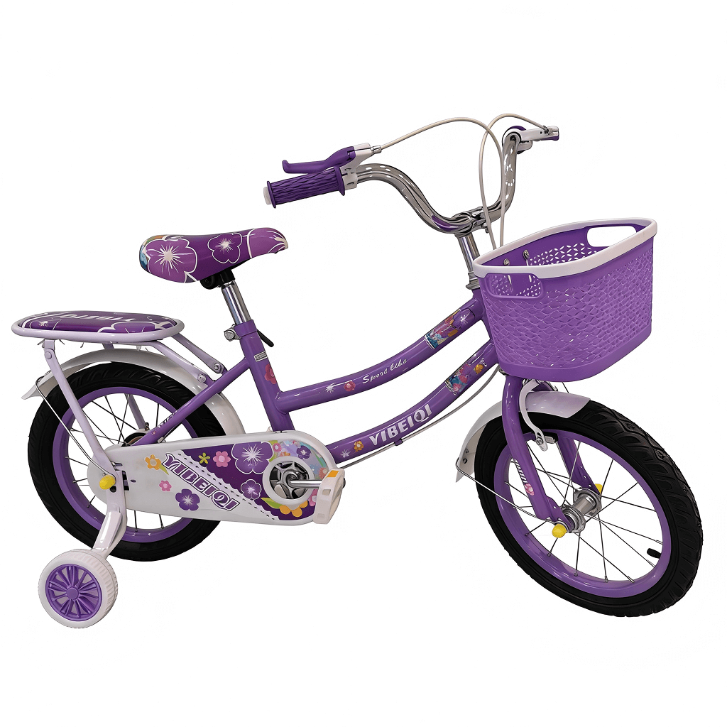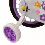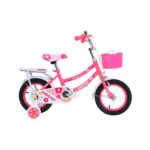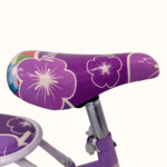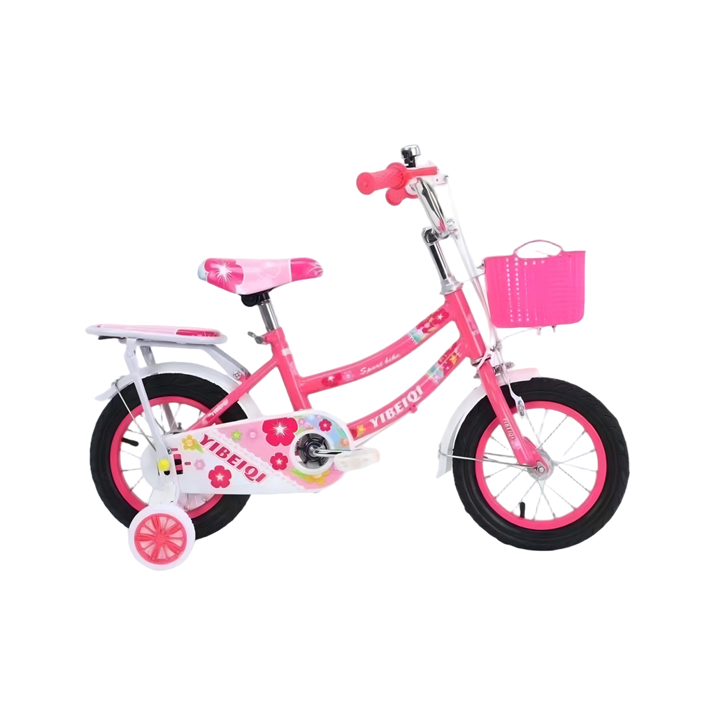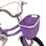 Children’s bicycle featuring a bright, playful design with floral patterns, training wheels, and a front basket. The bike includes a padded seat, step-through frame, and rear carrier for added convenience. It has rubber handle grips, chain guard, and durable tires suitable for kids learning to ride.