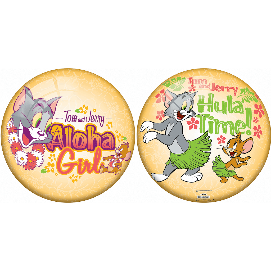 LICENSED BALL TOM AND JERRY 23cm : Two Tom and Jerry-themed inflatable beach balls with fun Hawaiian-inspired designs. The first ball displays Tom and Jerry surrounded by colorful tropical flowers, with the bold text “Aloha Girl.” The second ball shows Tom and Jerry dressed in hula skirts, dancing joyfully with vibrant floral graphics and the phrase “Hula Time!” Both designs use warm yellow tones, hibiscus-style patterns, and playful character illustrations, making these beach balls perfect for summer activities, pool play, kids’ outdoor fun, and tropical-themed merchandise.