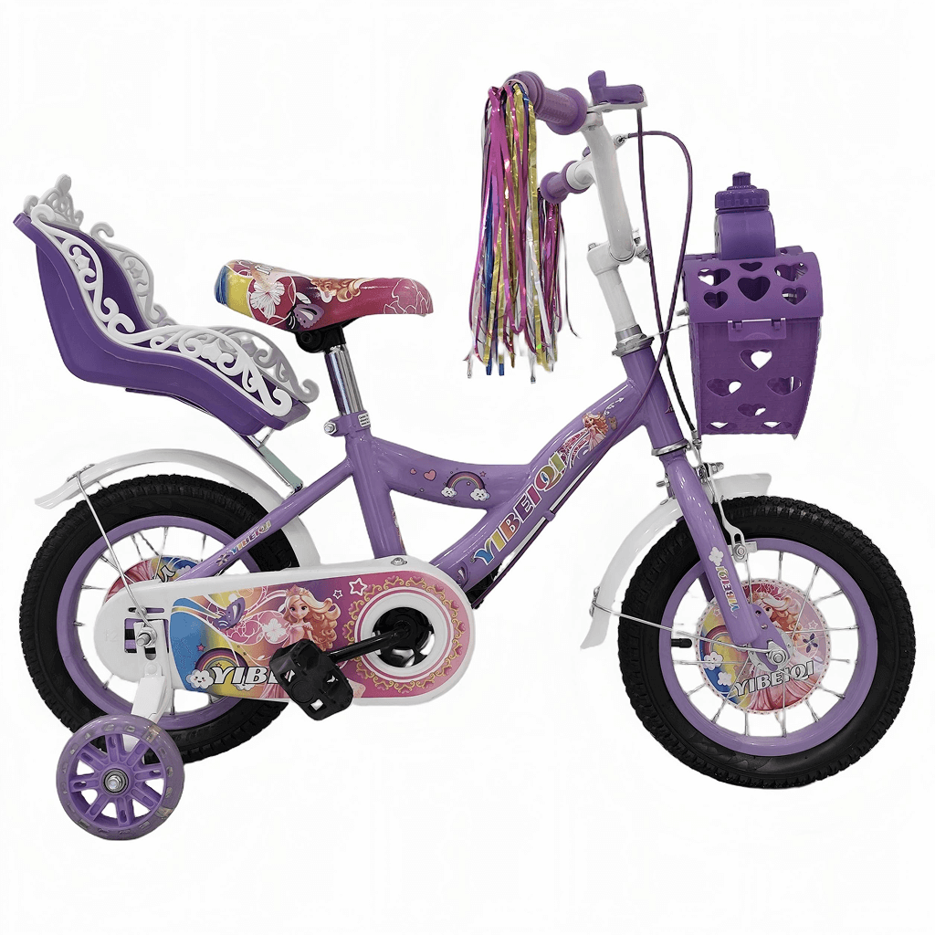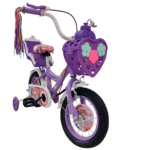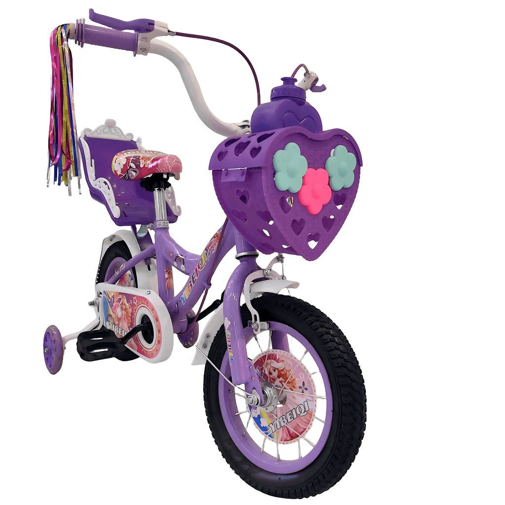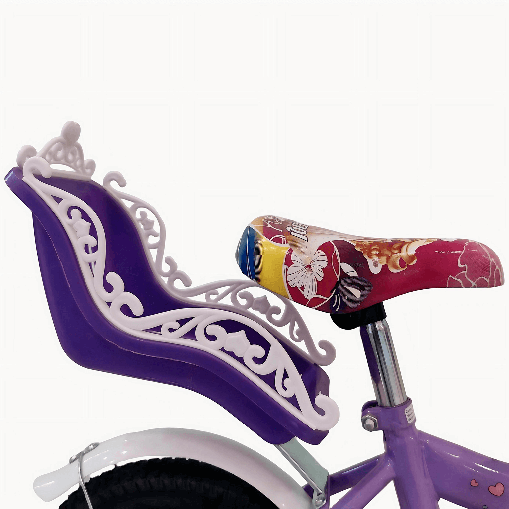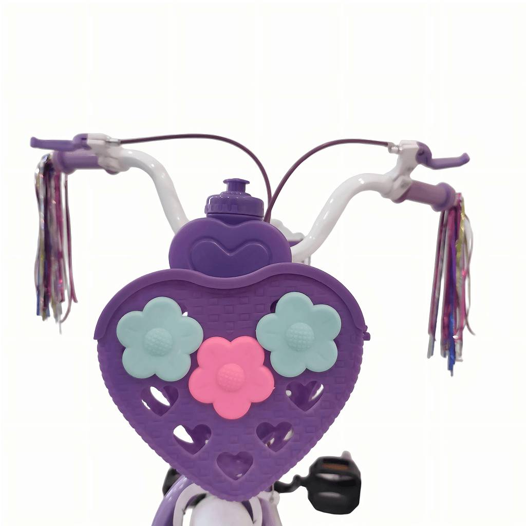 Children’s bicycle designed with a playful, princess-themed look and decorative graphics. It features training wheels to support young riders as they learn to balance and pedal confidently. A heart-shaped front basket and handlebar streamers add charm and provide space for carrying small items. The bike includes a rear doll seat, allowing kids to take their toys along for the ride. Its sturdy frame, protective chain guard, and comfortable saddle make it suitable and enjoyable for beginner riders.