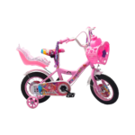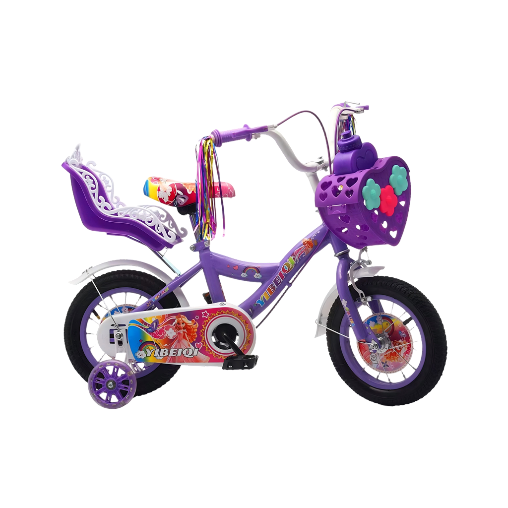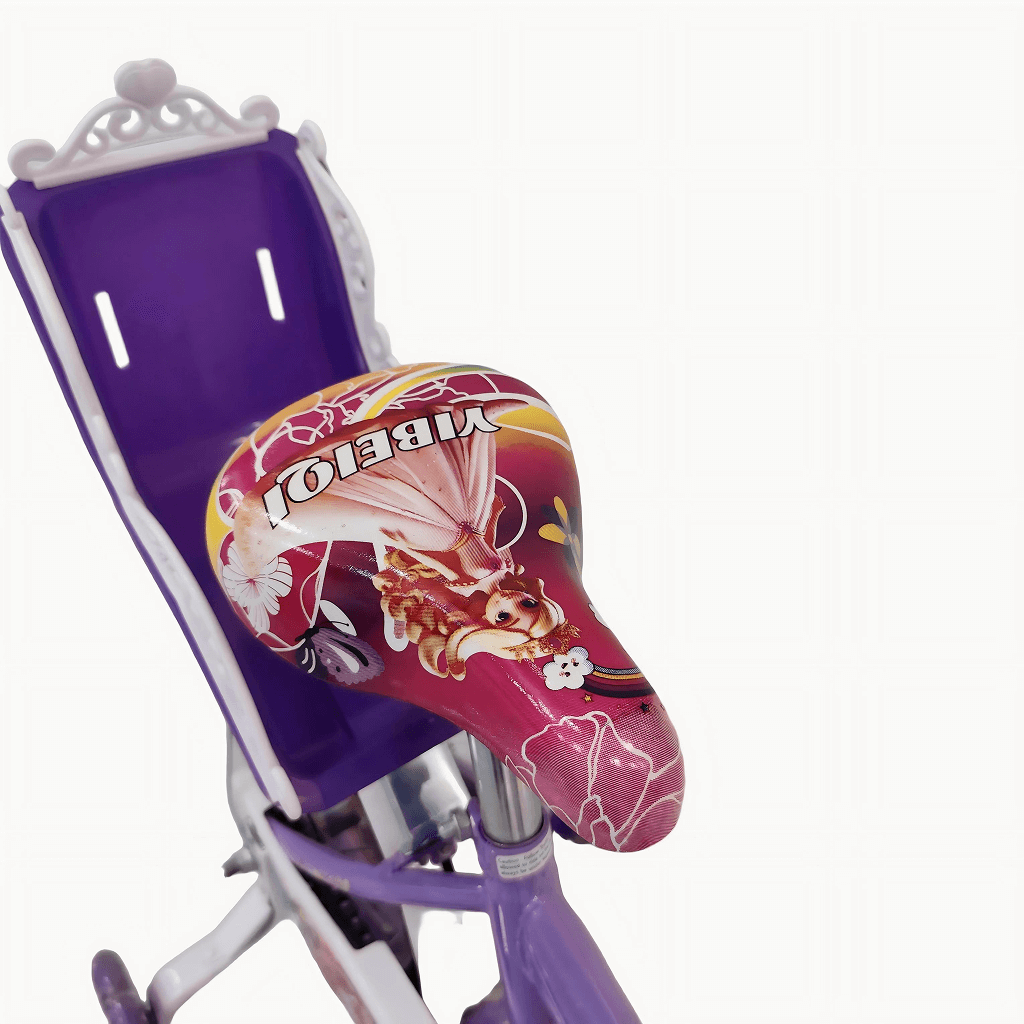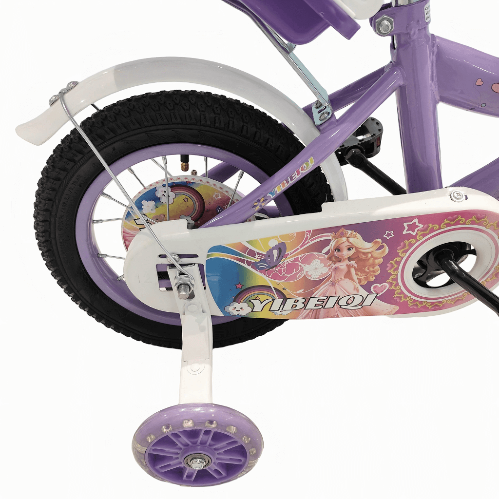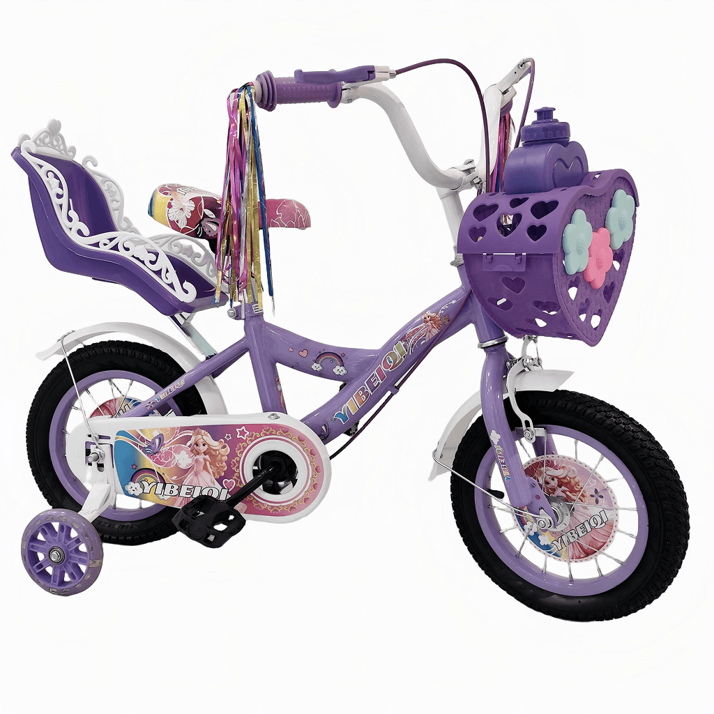 Children’s bicycle designed with a playful, princess-themed look and decorative graphics. It features training wheels to support young riders as they learn to balance and pedal confidently. A heart-shaped front basket and handlebar streamers add charm and provide space for carrying small items. The bike includes a rear doll seat, allowing kids to take their toys along for the ride. Its sturdy frame, protective chain guard, and comfortable saddle make it suitable and enjoyable for beginner riders.