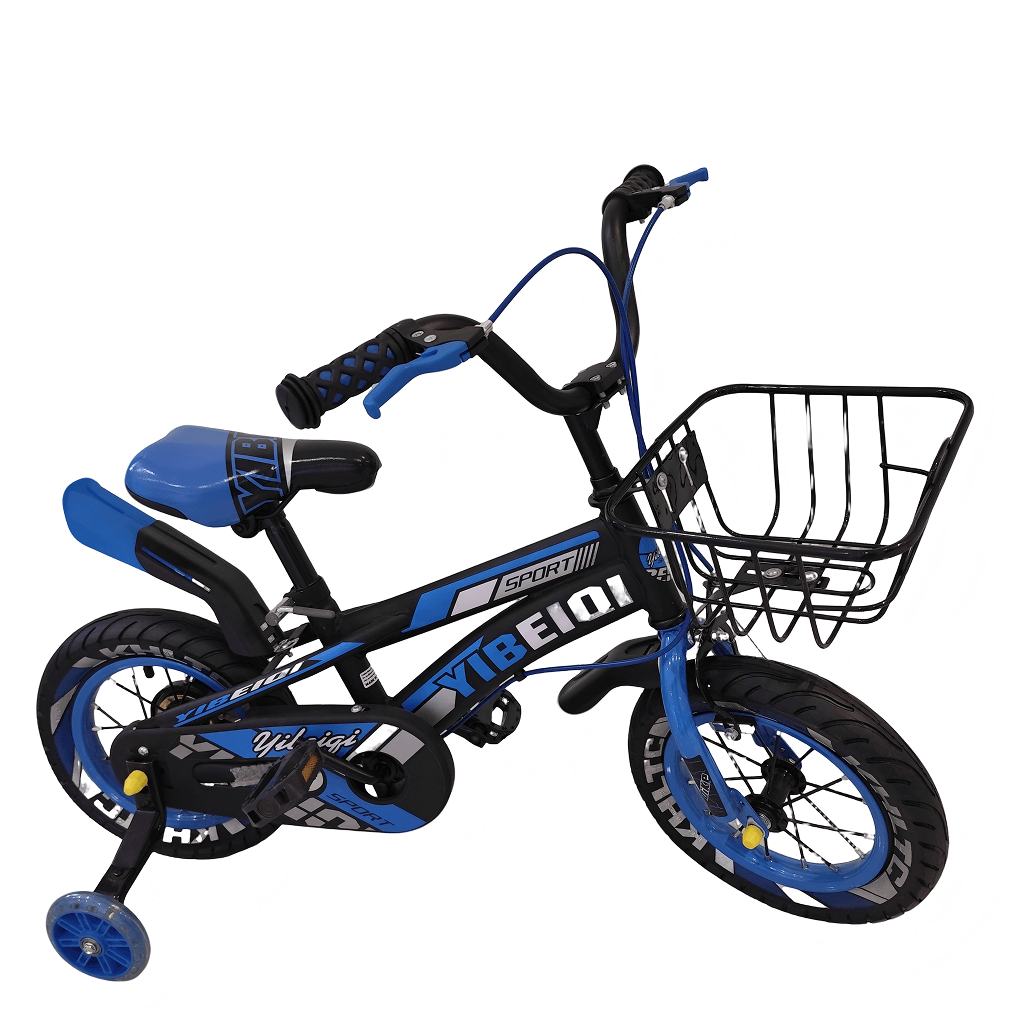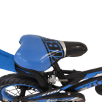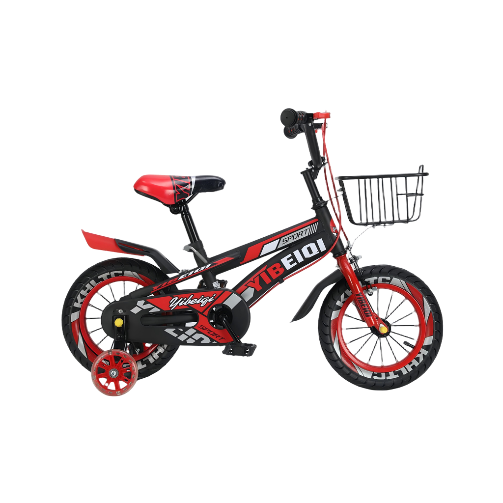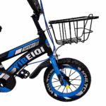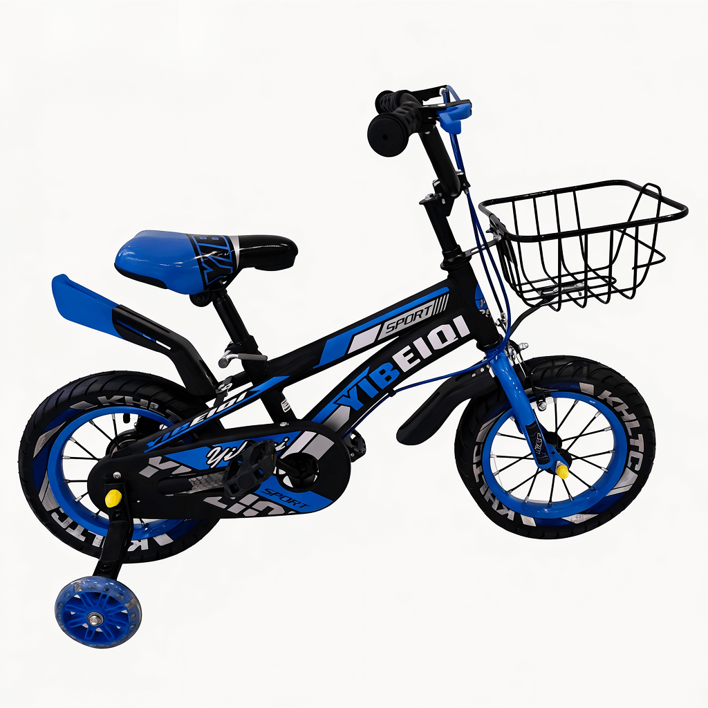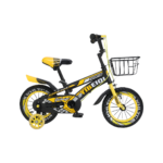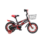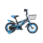 Sporty children’s bicycle equipped with training wheels, a front metal basket, and a durable steel frame. The bike features bold graphic decals on the chain guard and frame, giving it a stylish and energetic look. It comes with thick, treaded tires designed for stability and beginner-friendly riding. The padded saddle and safety-grip handlebars ensure a comfortable and secure ride. The overall design is eye-catching and built for kids learning to ride with confidence.
