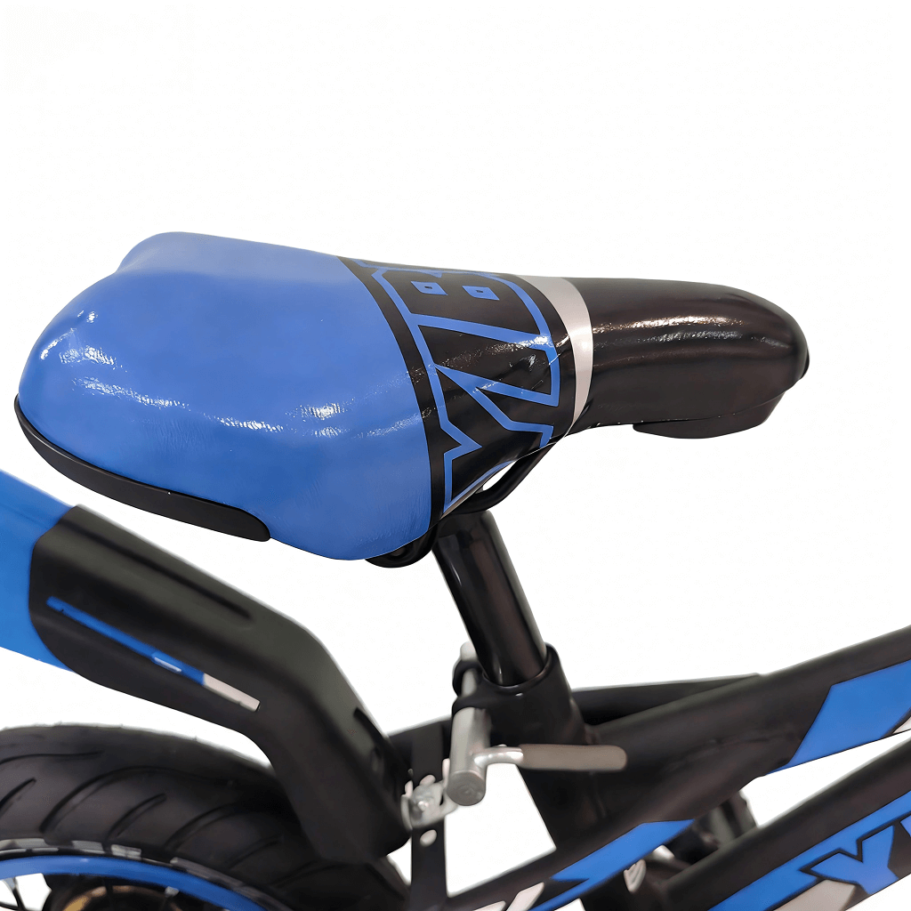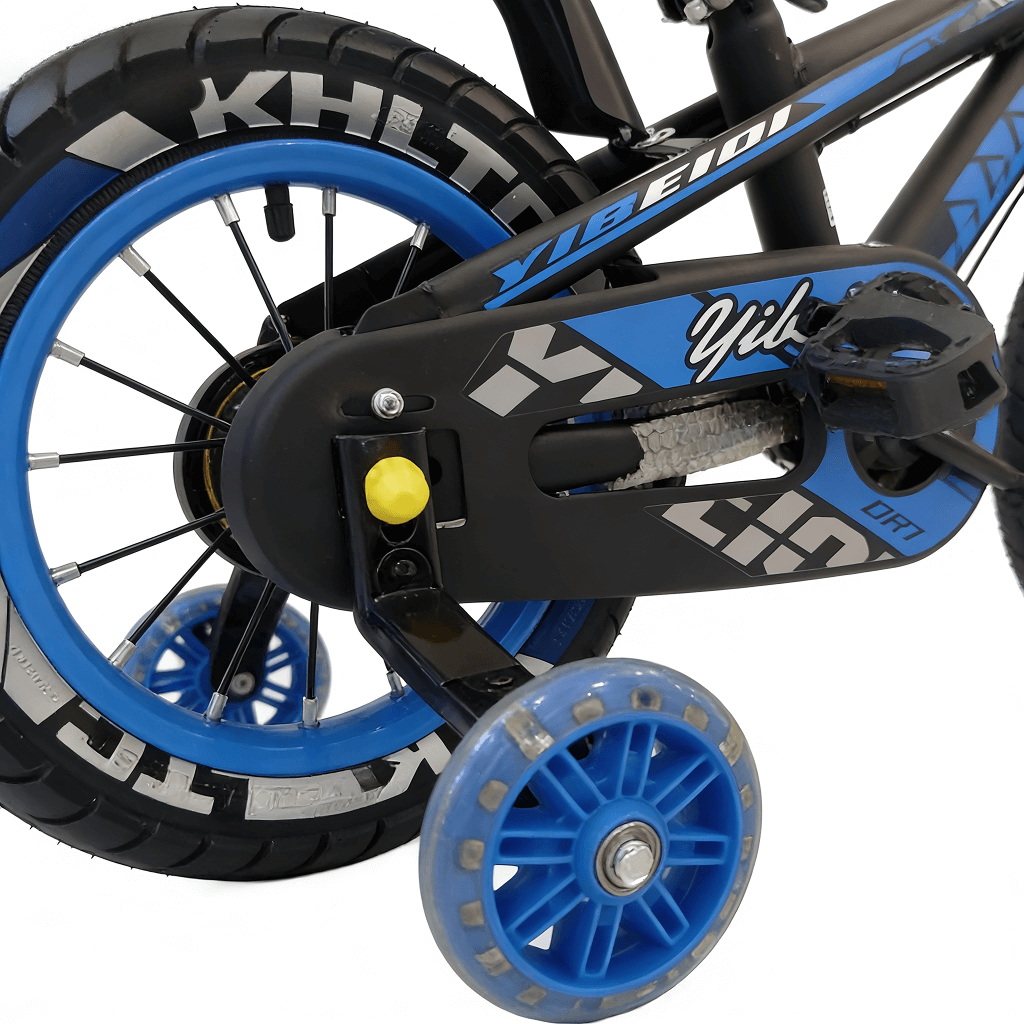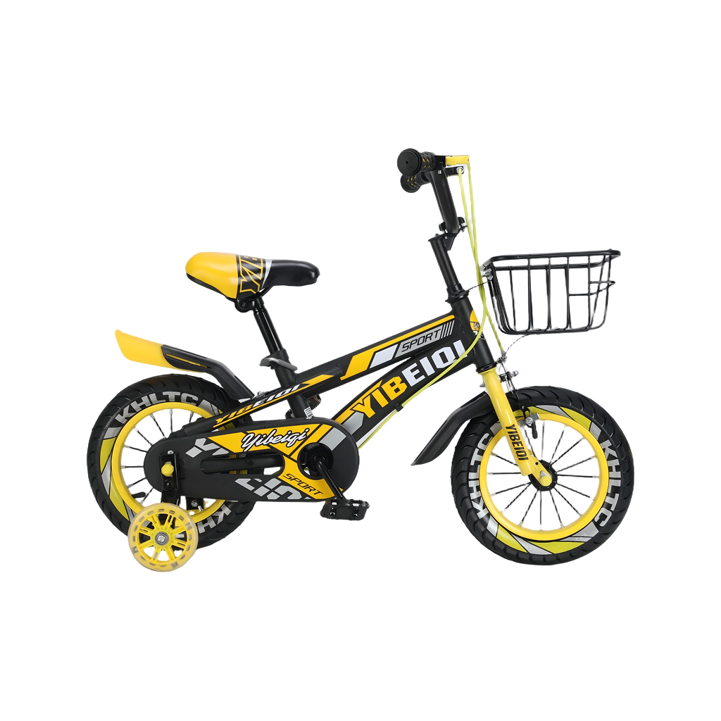 Sporty children’s bicycle equipped with training wheels, a front metal basket, and a durable steel frame. The bike features bold graphic decals on the chain guard and frame, giving it a stylish and energetic look. It comes with thick, treaded tires designed for stability and beginner-friendly riding. The padded saddle and safety-grip handlebars ensure a comfortable and secure ride. The overall design is eye-catching and built for kids learning to ride with confidence.