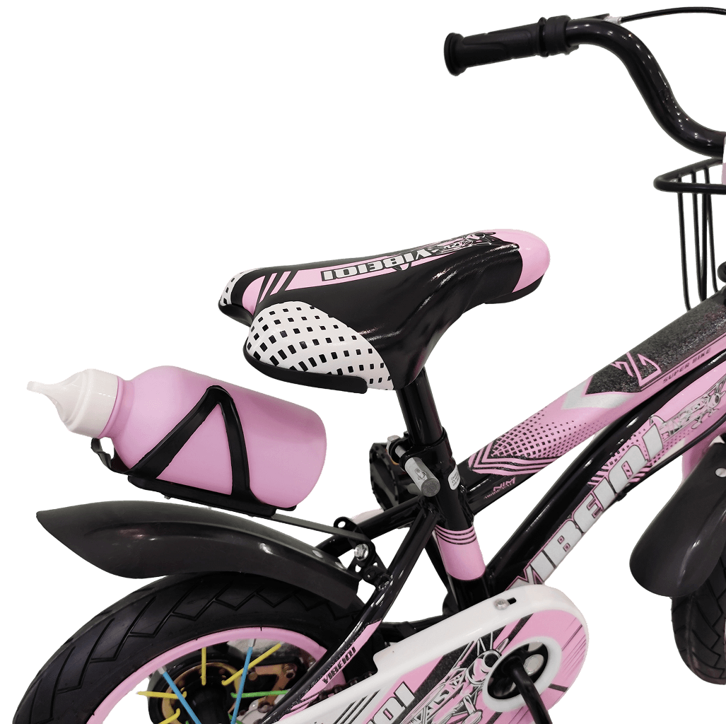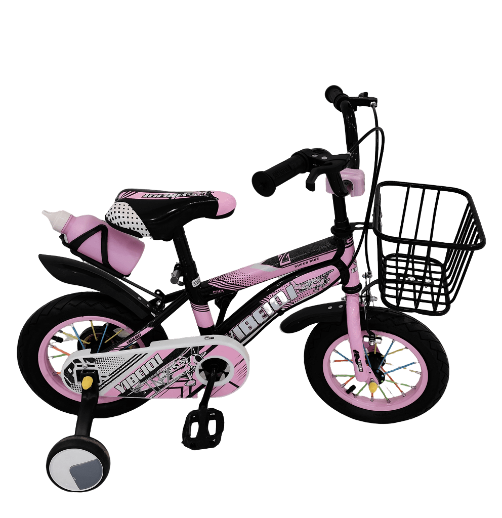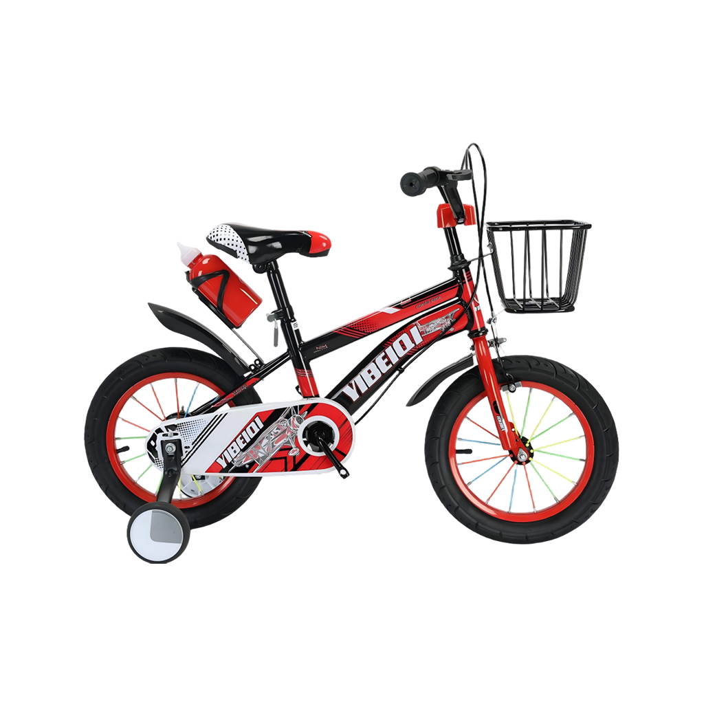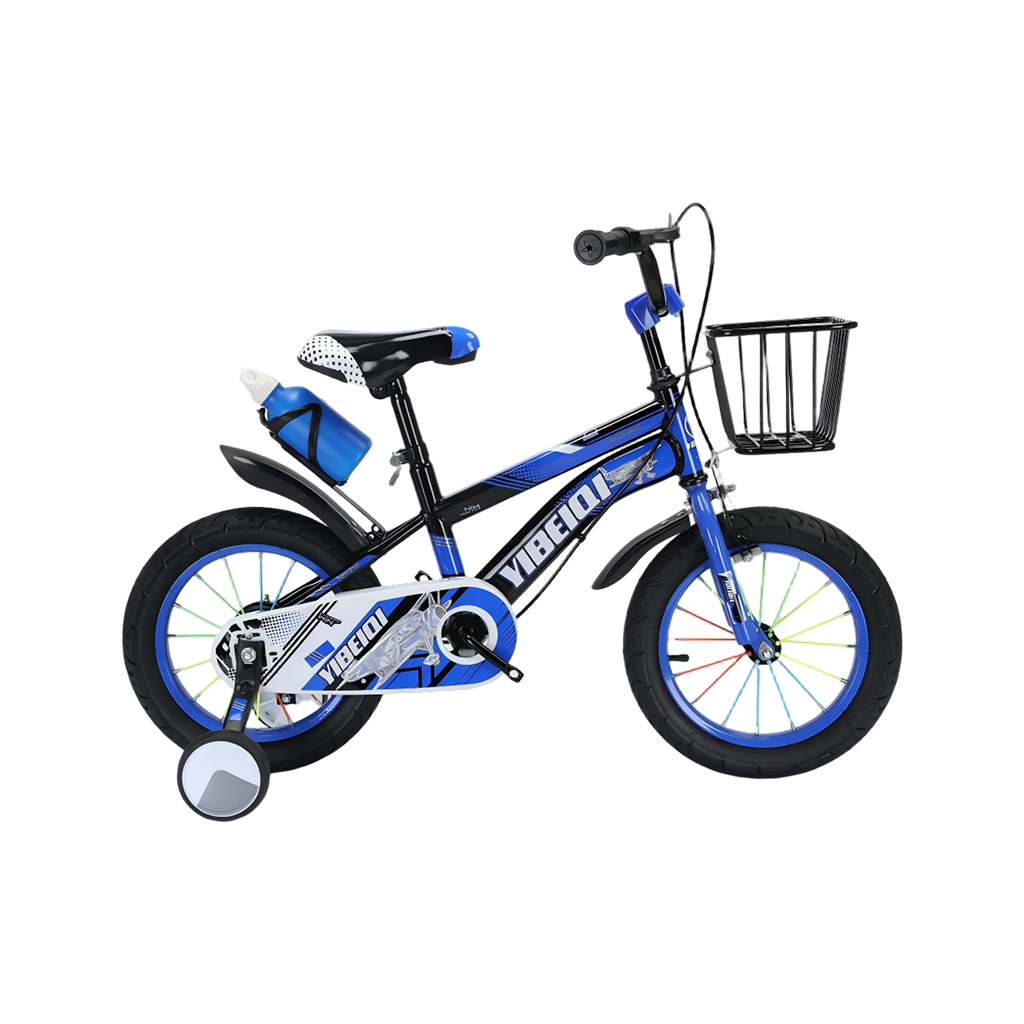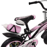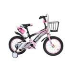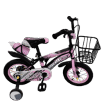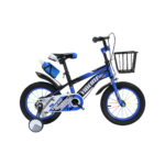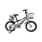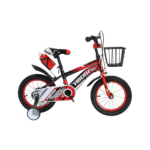 Sporty children’s bicycle designed with bold graphic decals and a sturdy metal frame. It features training wheels for balance, a front metal basket for carrying items, and a full chain guard for added safety. The bike includes thick, durable tires with accented rims and front and rear mudguards for protection. A padded saddle and safe-grip handlebars ensure comfort and control during riding. This kids’ cycle is built for stability, everyday use, and confident learning.