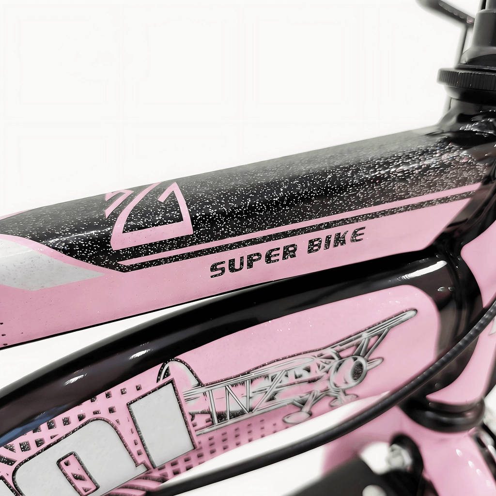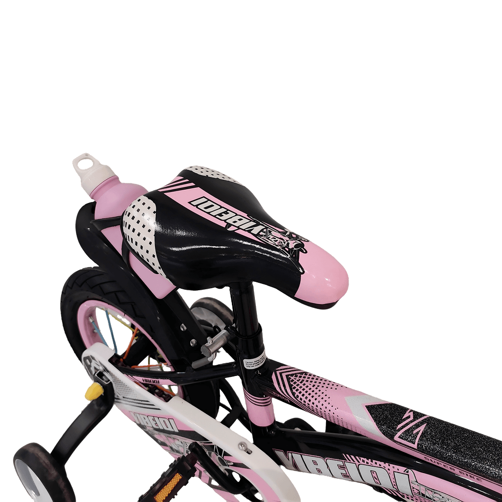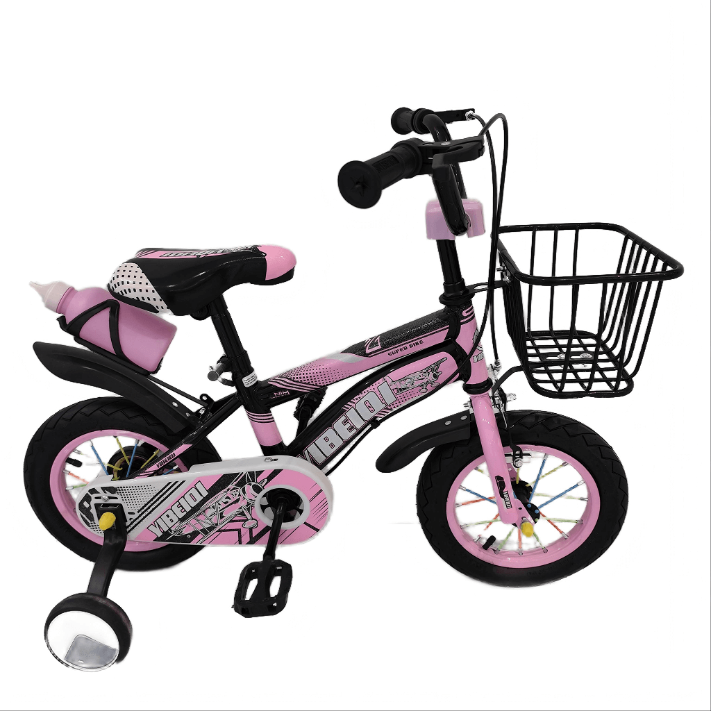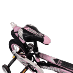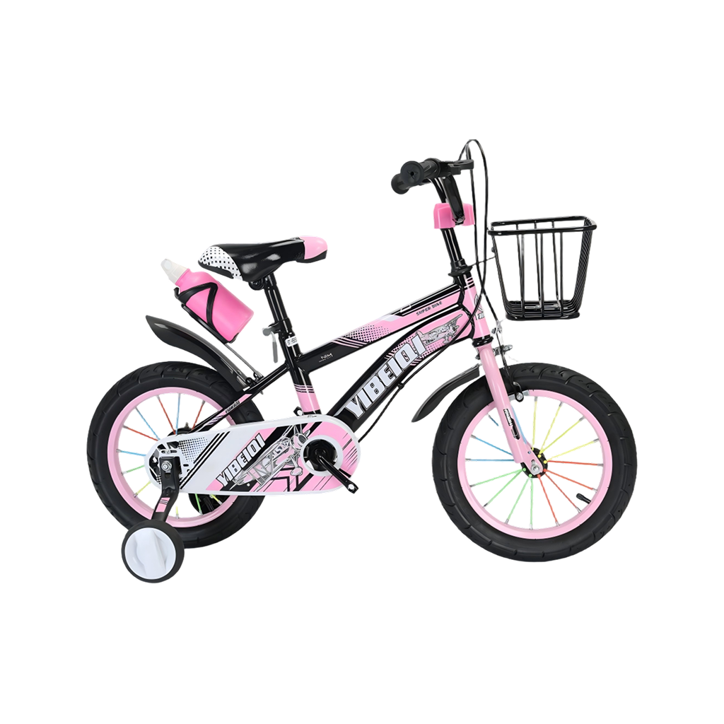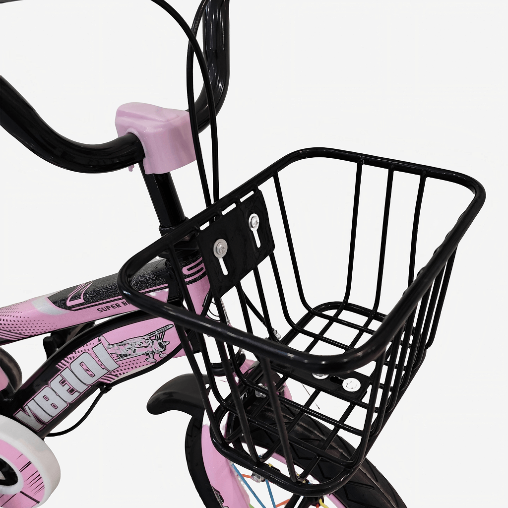 Sporty children’s bicycle designed with bold graphic decals and a sturdy metal frame. It features training wheels for balance, a front metal basket for carrying items, and a full chain guard for added safety. The bike includes thick, durable tires with accented rims and front and rear mudguards for protection. A padded saddle and safe-grip handlebars ensure comfort and control during riding. This kids’ cycle is built for stability, everyday use, and confident learning.