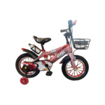 Children’s bicycle equipped with training wheels, a front basket, and a sturdy metal frame. The bike features a printed chain guard with graphic patterns and a comfortable padded saddle. It includes a water-bottle holder mounted behind the seat for added convenience. The wheels are thick and durable, designed for stability and beginner riding. The handlebars have safety grips, and the overall design is playful and kid-friendly.